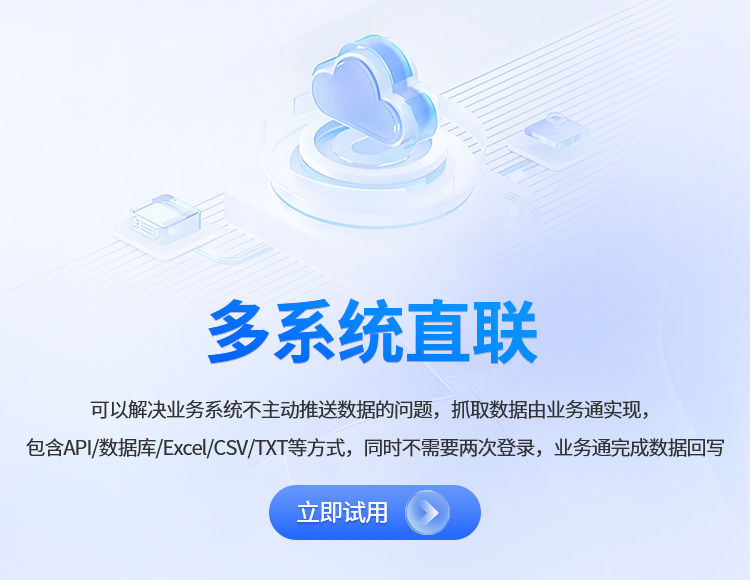 业务通可以解决业务系统不主动推送数据的问题,抓取数据由业务通实现,包含API/数据库/Excel/CSV/TXT等方式,同时不需要两次登录,业务通完成数据回写