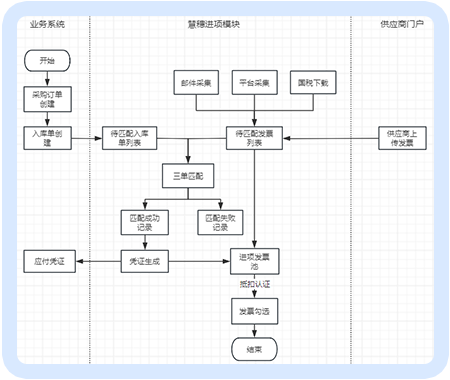 三单匹配预置自动和手工匹配逻辑,当发票入库时触发自动匹配;匹配失败记录进行手工匹配