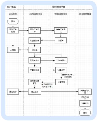 全局过程单据流转过程管理:购方采购订单创建流转、销方订单确认流程、发货通知、入库单生成、对账单生成、对账单确认、开票通知、销方按照开票通知开票(平台开/线下开导入)、销方发票自动更新匹配、凭证生成、发票自动入账、发票自动勾选。